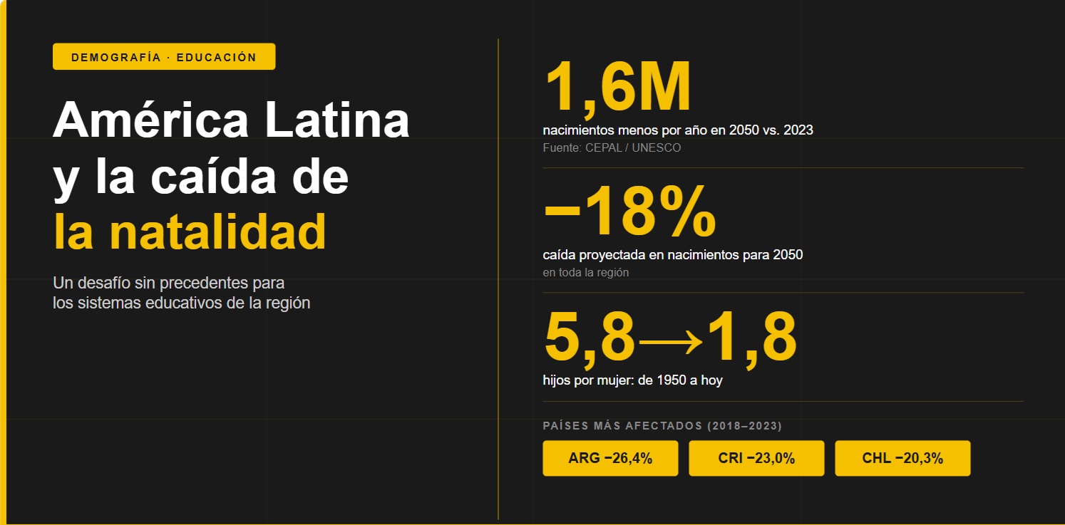 América Latina está atravesando una caída de la natalidad sin precedentes. Según un reciente estudio de CEPAL y UNESCO, en 2050 habrá 1,6 millones de nacimientos menos por año que hoy. Países como Argentina, Costa Rica y Chile ya registran contracciones de matrícula en los primeros niveles educativos.